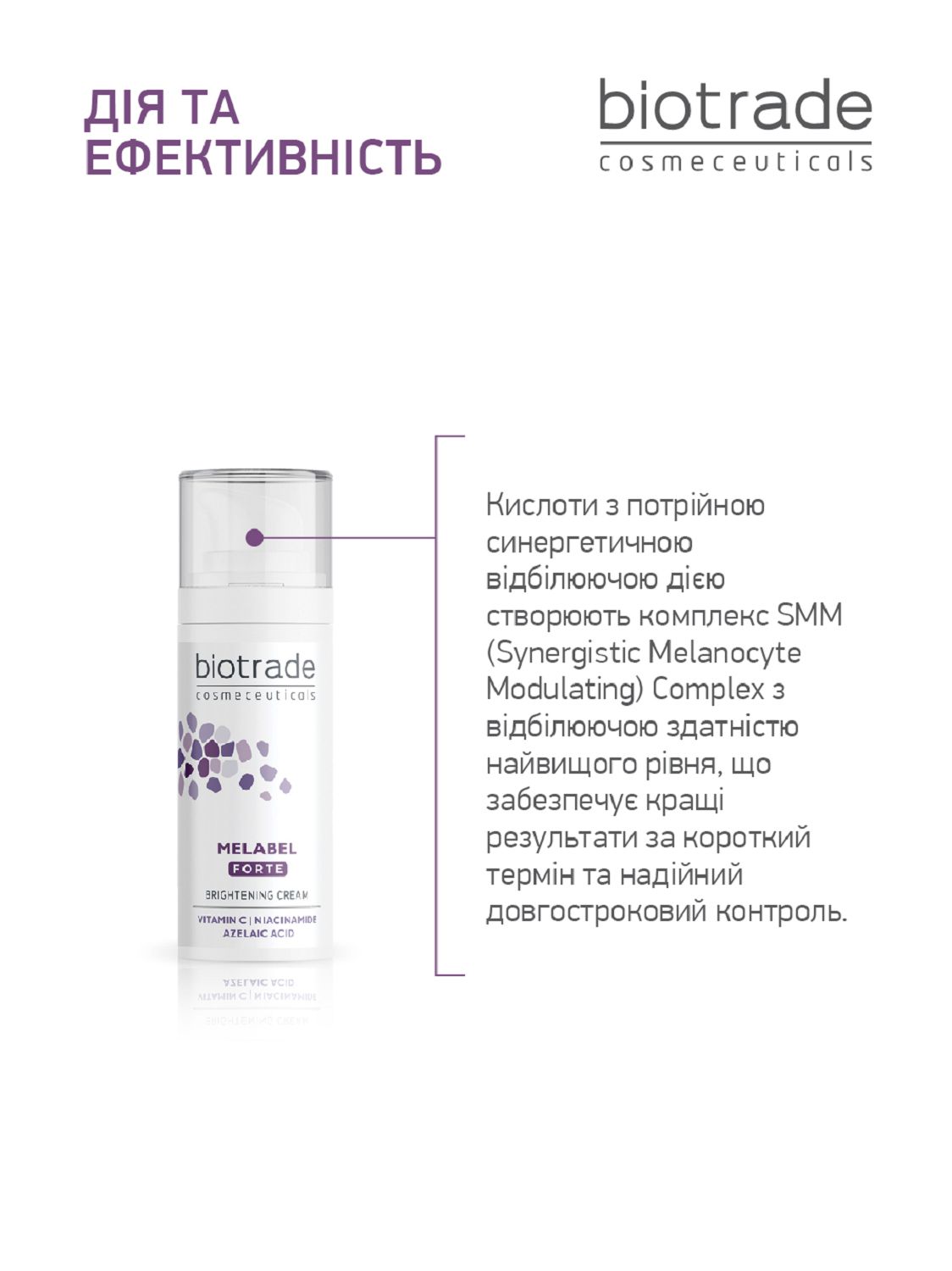 •  Потрійний ефект відбілювання для поступового освітлення стійкої гіперпігментації за рахунок кислот з потрійною синергетичною відбілюю чою дією. Вони створюють комплекс SMM (Synergistic Melanocyte Modulating) Complex з відбілюючою здатністю найвищого рівня, що забезпечує кращі результати за короткий термін та надійний довгостроковий контроль