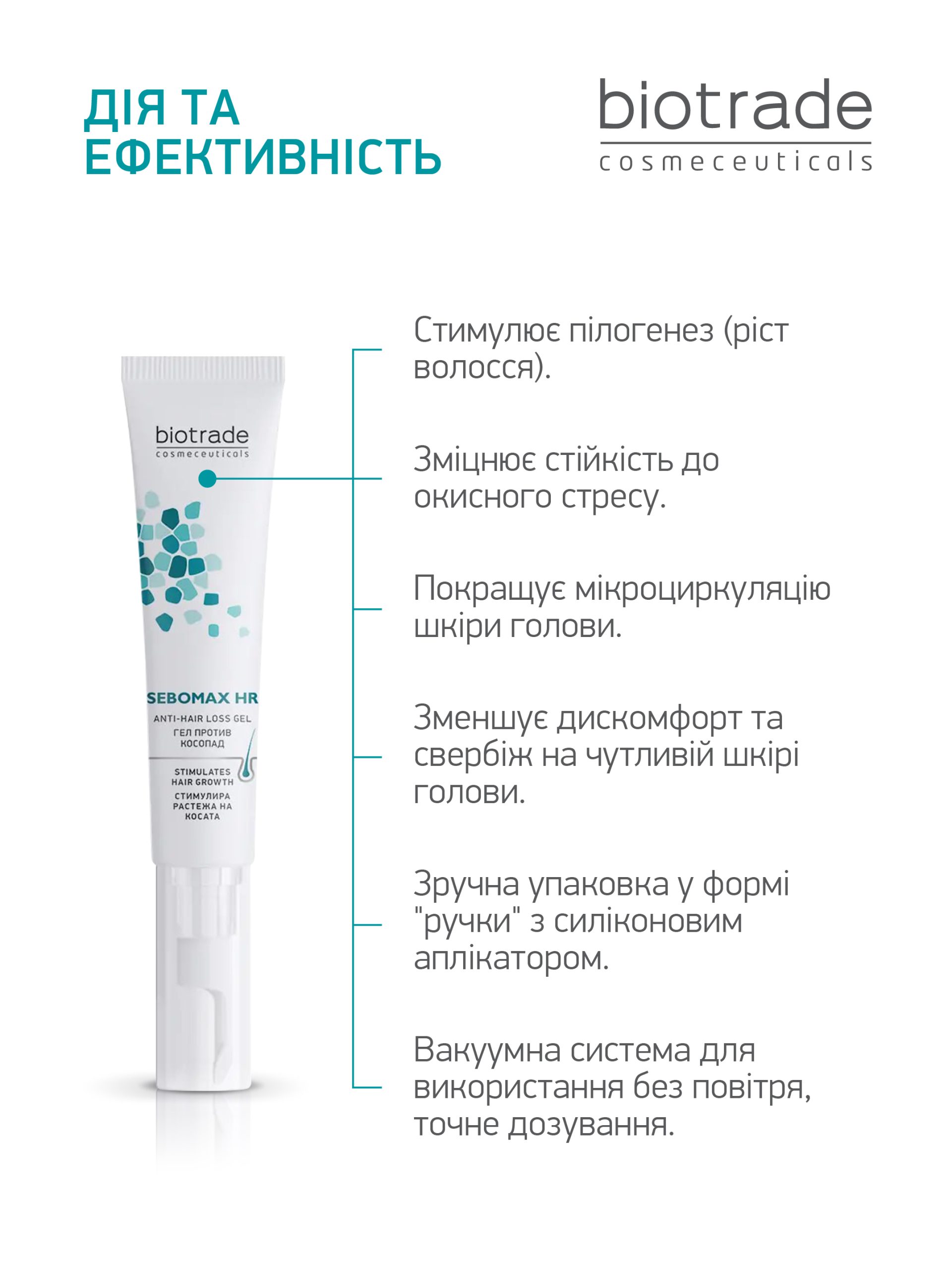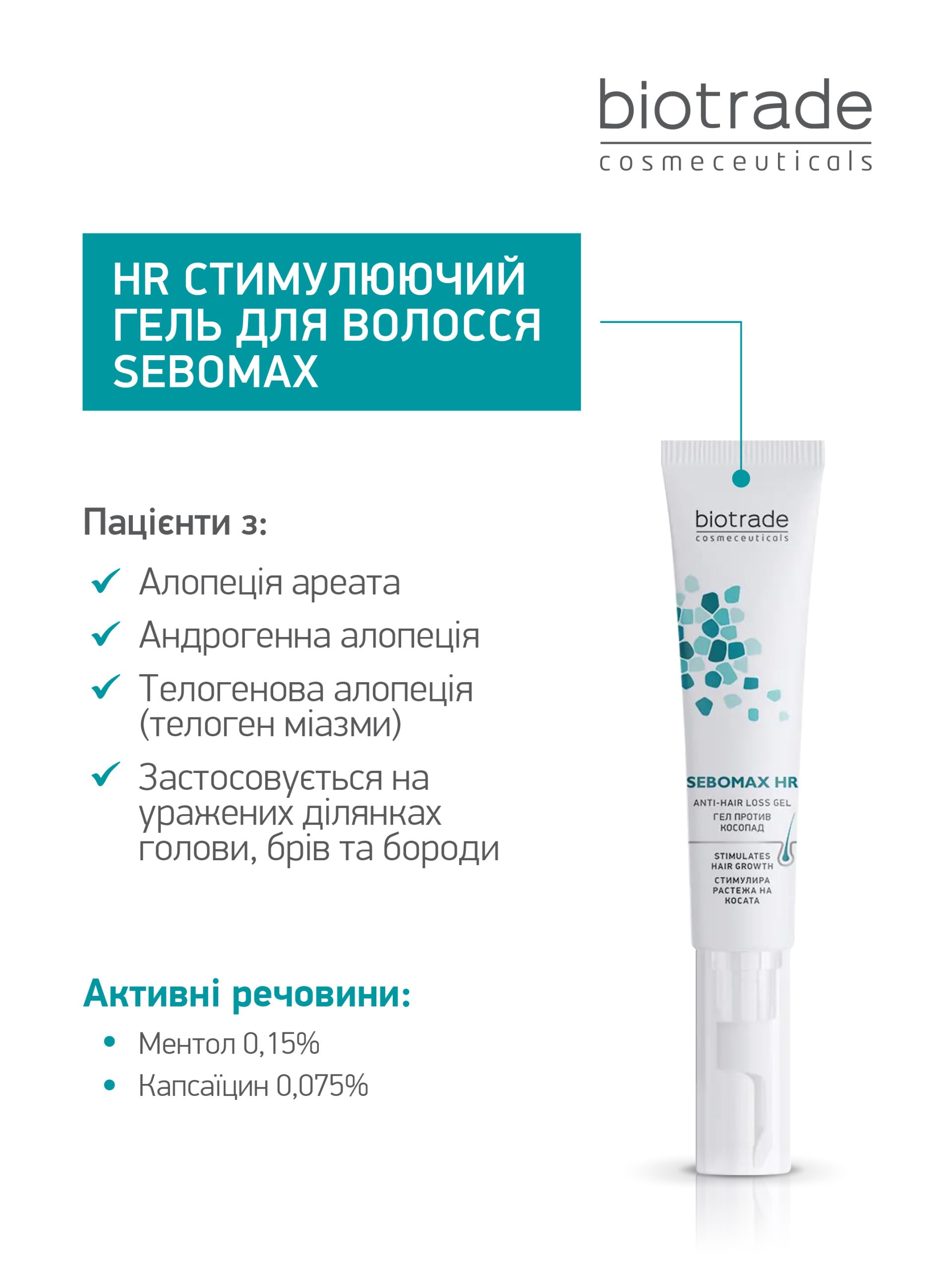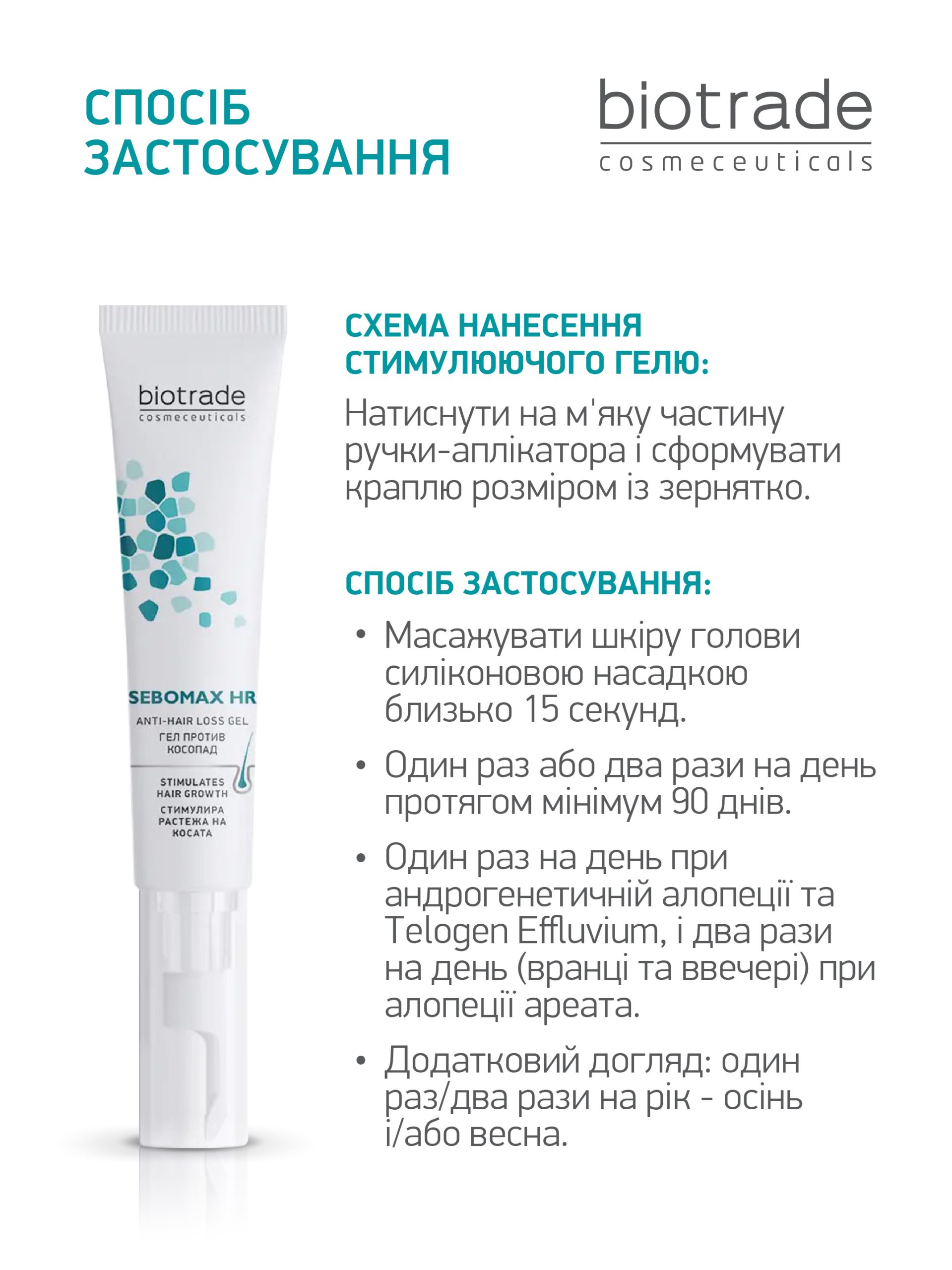 Рекомендуємо використовувати гель в комплекції з іншими засобами з лінійки Sebomax HR (шампунем, лосьйоном та харчовою добавкою)